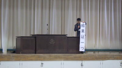 校長先生からは「結果は一つ。努力は無限。」というお話をしていただきました。何をするにも結果は一つです。それには、嬉しいことや悔しいこともあります。生徒の皆さんには結果も大事にしてほしいですが、それ以上にそれまで取り組んだ過程も大事にしてほしいと思います。その時にできる努力を最大限に行えば、すぐに結果として現れなくても、いつか実を結ぶはずです。諦めずに取り組んでみましょう。